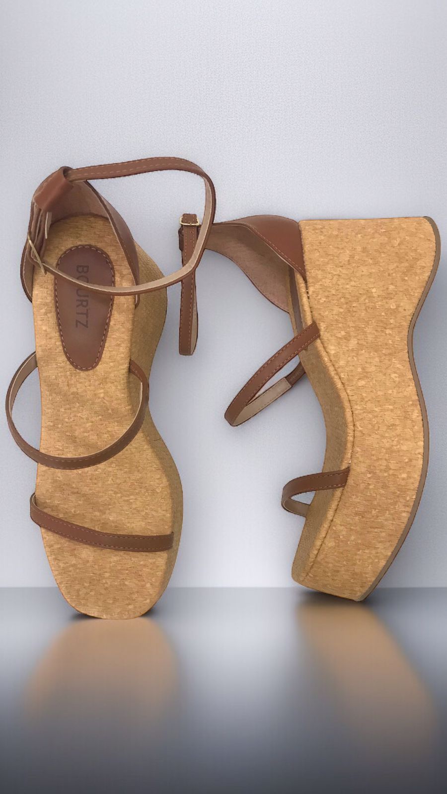 Com salto anabela em cortiça e acabamento em napa caramelo, essa sandália da Bourtz garante estabilidade e charme em cada passo. Ideal para alongar a silhueta sem abrir mão do bem-estar.